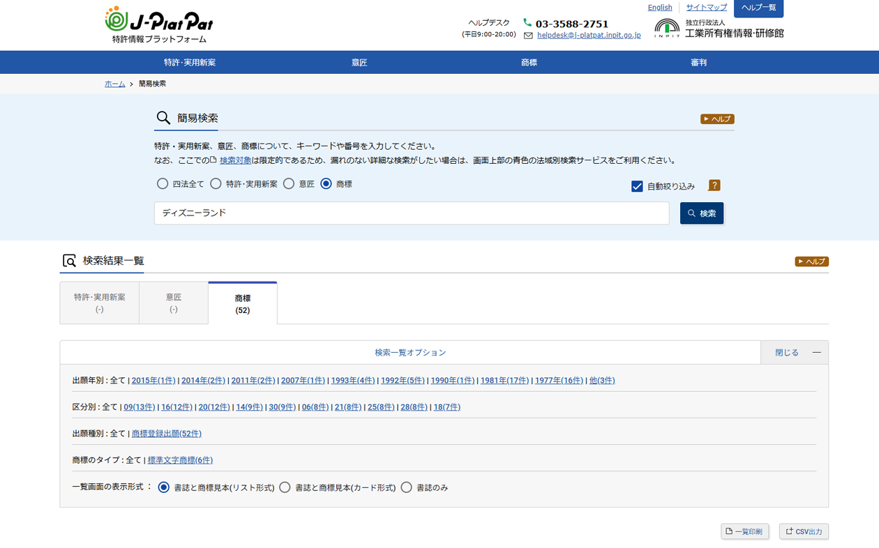 使用した名称を入力して、商標のチェックボックスにチェックを入れた上で、検索をすると、同じ呼称で登録されている商標が検索できます。